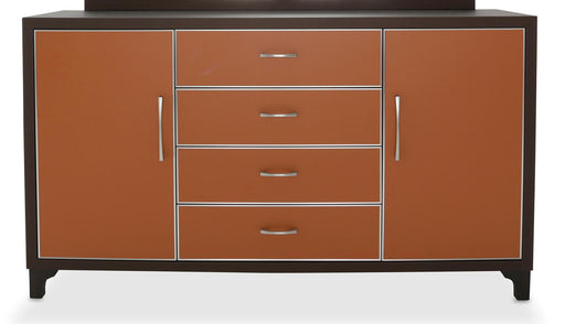 AICO21 Cosmopolitan Collection by Aico Furniture Orange and Umber finish 4 Drawers 2 Doors Shelf behind both doors All drawers have soft closing glide...