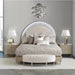 - Headboard features a half-moon panel upholstered in an ivory jacquard fabric