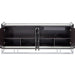 AICO Furniture Carmela Console Table in Glossy Charcoal Sand LFR-CRMA223-830. Designed for bold elegance, the Carmella Console Cabinet stuns with its shimmering black finish and captivating textures. Platinum trims frame the intricate door detailing, while a mirrored glass top and trim amplify its sleek, modern appeal. Set on a gleaming chrome base, this console offers both sophisticated style and ample storage with two cabinets, three shelving spaces, and a discreet drawer.