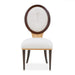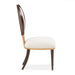 AICO Furniture Camellia Field Side Chair (Set of 2) in Warm Pecan 9090003-400. The Camellia Field Dining Side Chair blends elegance with unparalleled comfort. Its oval back showcases intricate camellia marquetry, while the warm pecan finish and antique gold accents create a harmonious balance of luxury and artistry. With a plush chenille seat and sturdy iron framework, this chair invites you to dine in effortless sophistication.