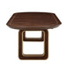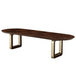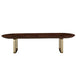 AICO Furniture Houston Oval Dining Table in Walnut 9095002-416. A statement of modern refinement, designed to anchor your dining space with elegance and versatility. The warm walnut finish is accentuated by a radial quartered veneer inlay, creating a mesmerizing tabletop design. A painted gold trim follows the table's graceful curves, adding a subtle touch of opulence. At the heart of its design is a sculptural, open-form base that balances bold structure with fluid elegance. Finished in walnut and framed with gold trim, the double-pedestal base introduces an architectural presence, making it as striking as it is functional.